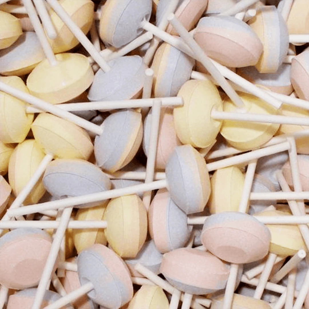 Each tub contains a mix of yellow and pink lollipops and blue and pink lollipops.