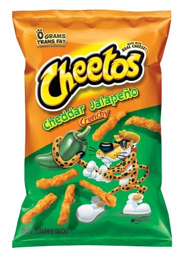 Cheetos Crunchy Cheddar Jalapeno corn snacks are deliciously cheesy with a hint of jalapeno spice that are perfect for enjoying on the go! Made with real cheese and zero grams of trans fat, these snacks are a guilt-free snack for any lover of spicy treats. Make sure you lick the dust from your fingers! BEST BEFORE 30/09/2022