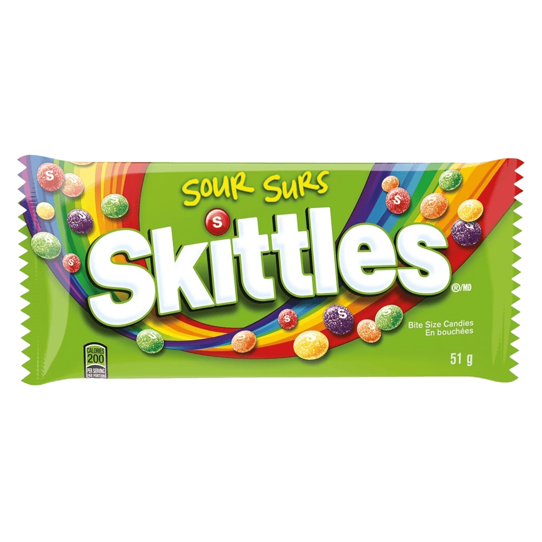 These Sour Skittles will have your lips puckering but you won’t be able to stop reaching for more! In classic flavours like sour grape, sour strawberry, sour lemon, sour green apple, and sour orange, try combining different colours for a new taste sensation! These Sour Skittles are different from the Australian ones in that the sour powder coats the Skittle, instead of being sour on the inside of the Skittle.