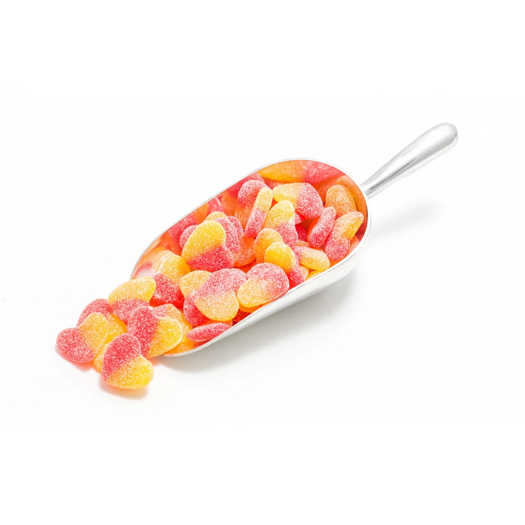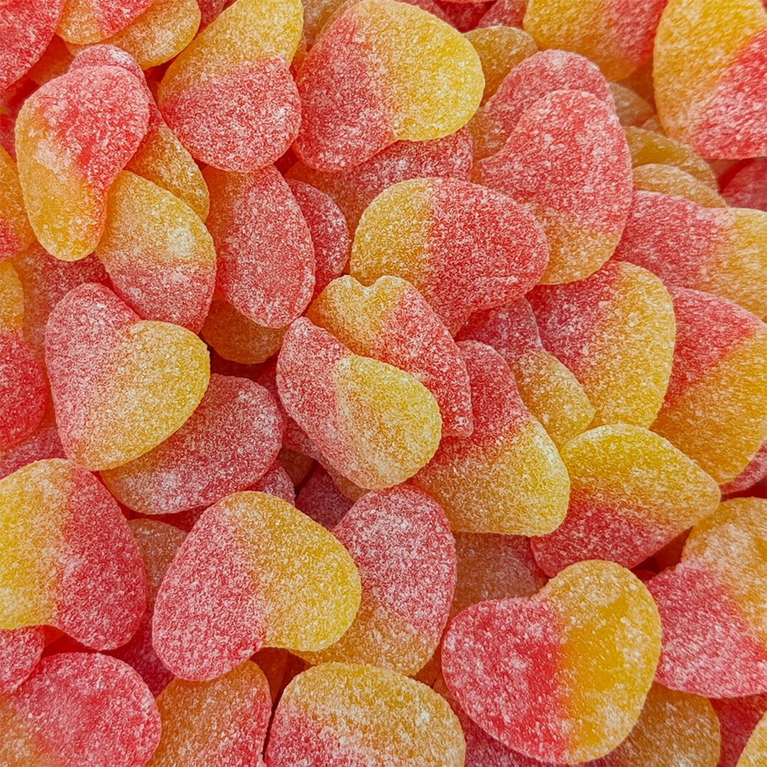 Sour Peach Hearts haveย half pink and half yellow colouring with a sour sugar coating and a delicious peach flavour.