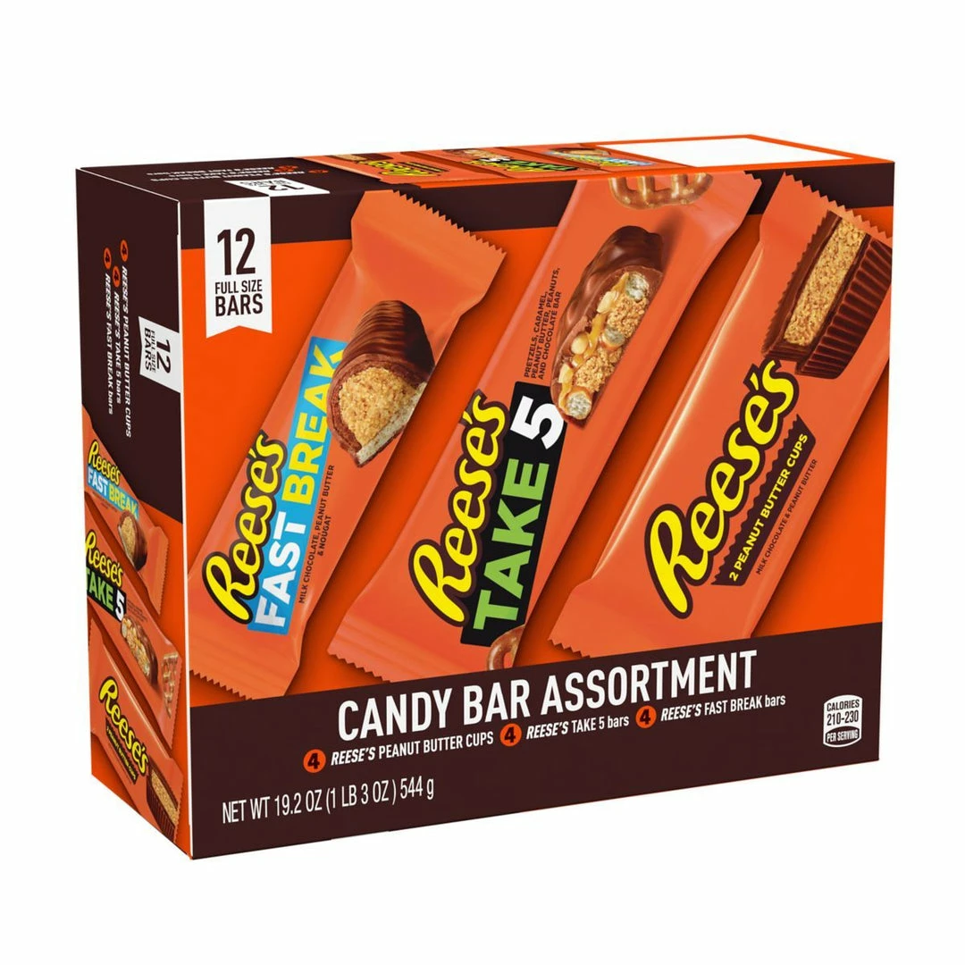 Contains 4 reese’s take 5 bars, 4 reeses peanut butter cups two packs and 4 x reese’s fast break bars.